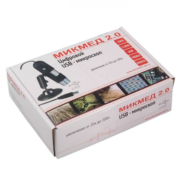 USB микроскоп Микмед 2.0 предназначен для проверки качества и тестирования объектов в различных областях промышлености при производственном контроле поверхностей, таких как машиностоение, электроника, полиграфия, ювелирной, а так же в текстильной промышленности и медицине. Отлично подойдет для использования в школах или для хобби, применяется в научных исследованиях. Благодаря своим компактным размерам микроскоп очень удобен при работе вне лаборатории. USB микроскоп Микмед 2.0 состоит из системы освещения, оптической системы и сенсора CMOS, имеет широкий диапазон увеличения от 20 до 200 крат. Оснащен хромированным металлическим кронштейном, подключается к компьютеру через USB порт и не требует дополнительного питания. Конструкция кронштейна позволяет исследовать объекты под любым углом. Программное обеспечение позволяет в любой момент наблюдения сделать фотографию, записать видеоролик и даже измерить габариты исследуемого объекта (с точностью до 0,01 мм). Изображения отображаются на экране ПК, их можно сохранять и редактировать с помощью программного обеспечения. Благодаря этому МИКМЕД 2.0 найдет широкое применение в школах и ВУЗах, в медицинских учреждениях, на предприятиях, для личного пользования и с целью ознакомления детей с окружающим микромиром. Размер поля зрения (видимой в микроскоп части исследуемого объекта) зависит от увеличения, которое регулируется путем изменения расстояния от объектива до исследуемого объекта. Наведение на резкость осуществляется с помощью фокусировочного кольца на корпусе. МИКМЕД 2.0 позволяет исследовать плоские и объемные объекты, на расстоянии от 0 мм до бесконечности. — 2,3×1,7 мм, на расстоянии 55 мм — 25×20 мм, на расстоянии 150 мм — 52×39 мм, размер поля зрения в промежуточных расстояниях будет отличаться. Особенности МИКМЕД 2.0