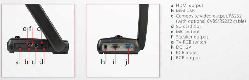 • Входы/выходы: HDMI (Out), Composite Video (Out), RS232, SD-card слот, Mic (Out), Speaker (Out), RGB (In/Out)