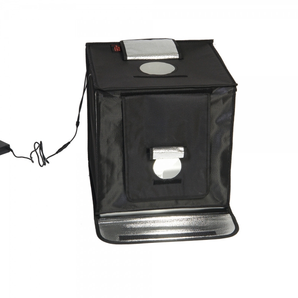 Фотобокс Falcon Eyes Light Cube 40 LED со светодиодным освещением Falcon Eyes Light Cube 40 LED - автономная мини-студия для фотографирования небольших объектов, внутренний размер фотобокса 40х40х40 см. Используется в предметной съемке для печатных каталогов, интернет-магазинов, Конструкция разворачивается в квадратный легкий фотобокс и оборудована своим собственным источника света с цветовой температурой 5500К. Внутренние серебристые текстурированные стенки равномерно заполняют куб отраженным светом от двух светодиодных линеек (по 28 светодиодов на каждой). Светодиодные линейки установлены на верхней крышке фотобокса, их можно легко переместить вдоль крышки благодаря системе липких лент (велкро). Монтаж конструкции осуществляется также с помощью липких лент, расположенных по периметру стенок. В сложенном виде занимает мало места, складывается в кейс с ручкой. Light Cube 40 LED имеет откидную переднюю панель со встроенным съемочным окном 18х28 см и отверстием диаметром 8,5 см, а также верхний люк диаметром 11 см для съемки с верхнего ракурса. Фотобокс поставляется с черным, белым и оранжевым пластиковыми фонами для размещения разных цветных предметов. Данная модель отличается от ранее представленных. В новых фотобоксах появился адаптер для регулировки яркости.