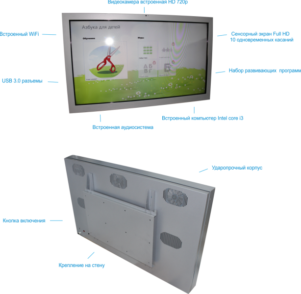 Панель Project Touch 32" комплектуется встроенным компьютером (технические характеристики: процессор Intel i3 3.7 ГГц, твердотельный накопитель SSD60/4Gb, Wi-Fi), веб-камерой разрешением HD 720p, встроенными колонками мощностью 2х10 Вт. Корпус панели металлический и ударостойкий. Сам экран защищен специальным стеклом толщиной 6 мм, что надежно защищает панель от негативных воздействий.