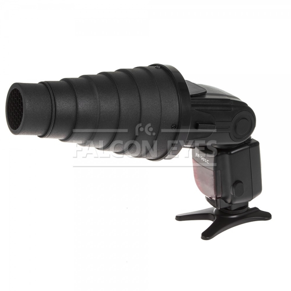 - коническая насадка, изготовлена из металла, длина 145 мм, диаметр выходного отверстия 40 мм, в комплекте две сотовые насадки с размером ячеек 2 мм и 3 мм: используя вспышку вне камеры, комплект позволит создать выразительный световой акцент на объекте съемки.