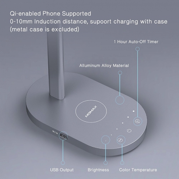 Momax LED Desk Lamp with Wireless Charging Pad - это устройство, которое совмещает в себе настольную лампу и платформу для беспроводной зарядки смартфонов. Лампа имеет регулировку яркости и температуры света, а также выбор угла наклона. Кроме того, в модели предусмотрен выход USB для проводной зарядки смартфонов или планшетов. Momax LED Desk Lamp with Wireless Charging Pad изготовлена из легкого алюминия, что гарантирует высокую прочность и долговечность. Платформа для зарядки позволяет без труда разместить любой смартфон. Модель имеет возможность регулировки температуры света в диапазоне от 2800 до 6500 K. Momax LED Desk Lamp with Wireless Charging Pad станет отличным решением для зарядки смартфонов, в которых имеется поддержка стандарта Qi. Лампа позволит комфортно читать книги или журналы, выдавая приятное освещение. Продуманная конструкция и настройка угла наклона обеспечивают удобное использование лампы как на рабочем столе, так и на прикроватной тумбе.