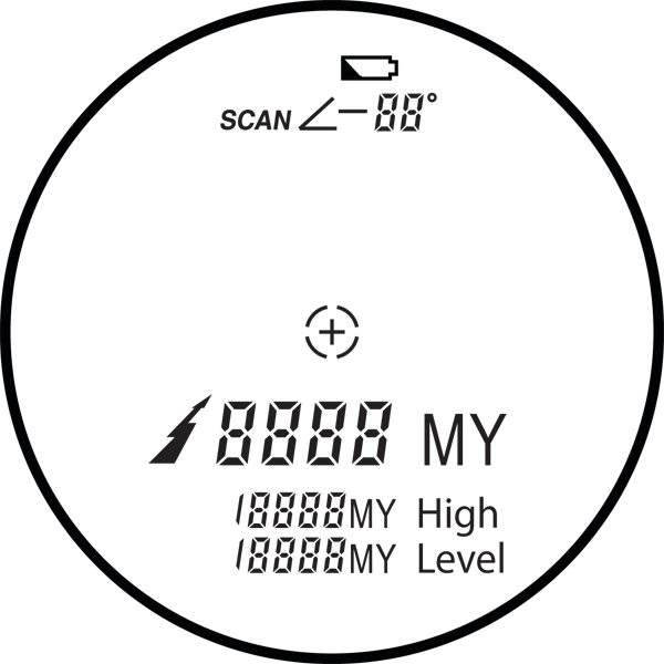 Прибор известит хозяина о том, что пора заменить батарею если она "села" - для этого в поле зрения появляется специальный индикатор. При проведении замера, работе лазера включается индикатор "молния". При длительном нажатии кнопки питания происходят непрерывные измерения со сменой результата - функция "сканирование", измерения прекращаются при отпускании кнопки. Дальномер Sturman LRF 400 HR оборудован окуляром с возможностью диоптрийной подстройки.