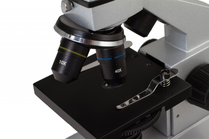 Микроскоп снабжен револьверной головкой на три объектива – это делает смену увеличения быстрой и удобной. Для того чтобы заменить используемый объектив (а, следовательно, и увеличение), достаточно повернуть револьверную головку на треть оборота – это можно сделать буквально за одну-две секунды.