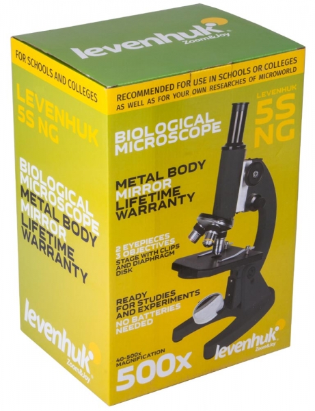 Микроскоп Levenhuk 5S NG – оптический прибор начального уровня, который можно использовать для учебы или научного хобби. Он прекрасно подойдет для ребенка или ученика младшей или средней школы. С помощью Levenhuk 5S NG можно выполнять лабораторные работы по биологии, проводить научные эксперименты в стенах дома, исследовать микромир. Микроскоп обеспечивает увеличение до 500 крат, на котором прекрасно видны простейшие одноклеточные. Этой кратности хватит и для изучения готовых микропрепаратов.