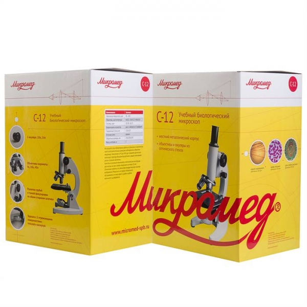 От своих «прародителей» МИКРОМЕД С12, конечно, отличается качеством картинки. Три объектива — ахромата с просветленной оптикой из оптического стекла дают резкое, контрастное изображение с реальной цветопередачей по всему полю зрения. По совокупности своих эксплуатационных и оптических характеристик микроскоп МИКРОМЕД С12 рекомендован для использования в медицинских лабораториях (рег. уд. № ФСЗ 2007/00554 от 26 декабря 2007 года), однако благодаря демократичной цене его часто приобретают школы для уроков биологии, также хорош он и для домашних исследований. Еще одно удобство — съемный окуляр. Его можно заменить на стандартный окуляр с другим увеличением или на видеоокуляр (приобретаются отдельно). Картинку с видеоокуляра можно передавать на ПК и обрабатывать изображение в соответствии с возможностями прилагаемой к нему программы. Следует отметить, что микроскоп МИКРОМЕД С12 довольно большой и тяжелый, в нем все (кроме поверхности ручек фокусировки), сделано из металла. Однако, чем массивнее конструкция, тем меньше она подвержена влиянию внешних воздействий, ухудшающих качество наблюдений — тряске, случайных неаккуратных движений и прочее.