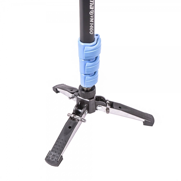 К нижнему основанию монопода крепится опора из трех складывающихся стальных лапок с резиновыми вставками. Благодаря этой опоре монопод надежно устанавливается на любой поверхности. Опора на шаровом основании позволяет наклонять монопод под углом до 15˚, а специальная гайка поможет ограничить угол наклона до нужной величины. В ситуациях, когда не требуется дополнительная устойчивость или монопод используется только для фотосъемки, раскладывающуюся опору можно снять и установить вместо нее резиновую пятку (входит в комплект), это облегчит общий вес конструкции.