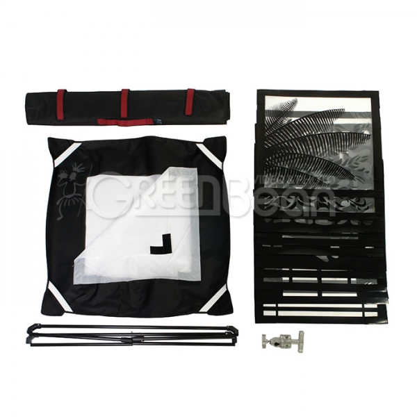 Effect Panel 60 состоит из трех основных компонентов: быстроскладного каркаса (размер 90х90 см), гибкого светоотсекающего экрана с окном (размер экрана/окна: 90х90 см/50х50 см) и десяти гелевых масок с разными узорами (также известных как флаги, "cucoloris" или "cookies"). Комплектуется крепежной муфтой для установки каркаса с масками на стойку.