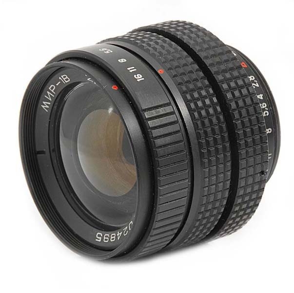 Объектив Мир-1В для М42 - представляет собой сменный объектив для отечественных однообъективных зеркальных камер марки «Зенит» и других с совместимым креплением. Крепление к камере - резьба М42×1/45,5. Объективы Мир-1 обладают следующей отличительной особенностью конструкции оправы: выступающий ободок вокруг задней линзы, верхняя половина окружности которого удалена, чтобы не мешать подъёму зеркала. Этот ободок предназначен для того, чтобы объектив можно было ставить на поверхность стола. Задняя линза при этом не касается поверхности.