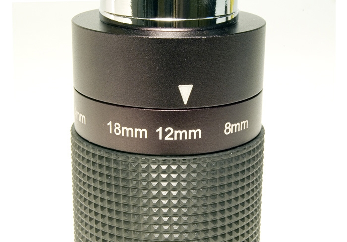Оптическая схема окуляра позволяет изменять фокусное расстояние в диапазоне 8–24 мм. На корпус окуляра нанесена специальная шкала, которая позволяет с максимальной точностью выставить желаемое фокусное расстояние. Все оптические компоненты окуляра изготовлены из стекла, на них нанесено многослойное просветляющее покрытие, что гарантирует отличное качество изображения.