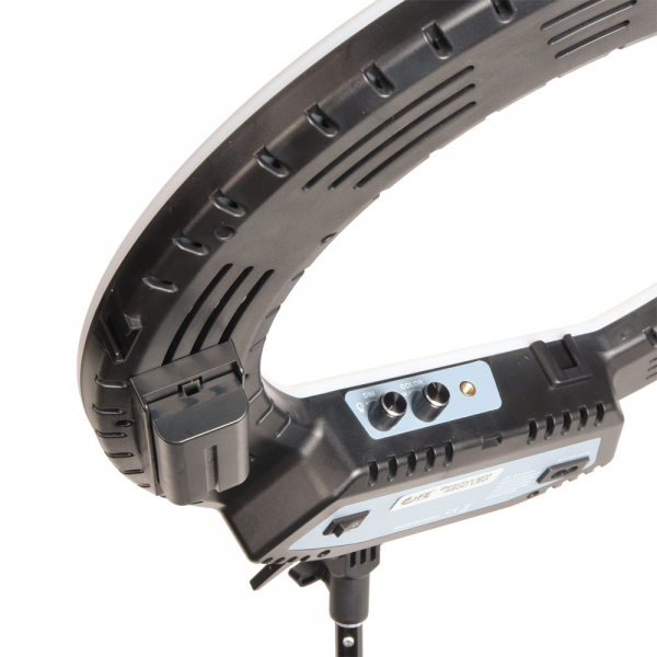Осветитель кольцевой Falcon Eyes BeautyLight 480G LED Светодиодный осветитель BeautyLight 480G LED лёгкий и компактный осветитель с источником света в виде кольцевой панели со светодиодами, с регулируемой мощностью светового потока и цветовой температурой. Для использования визажистами, гримёрами и стилистами важную роль играют бестеневой характер и возможность настройки цветовой температуры освещения. Небольшие размеры осветителя и низкий уровень потребляемой светодиодами мощности делают этот осветитель привлекательным также для использования в студии для портретной, предметной, рекламной и других видов фотосъемки. Корпус осветителя изготовлен из прочного ABS пластика. Под белым молочным рассеивателем находятся 480 ярких светодиода. На обратной стороне находятся тумблер включения/выключения питания, два гнезда для установки аккумуляторов N-PF, разъём для подключения к сети, регуляторы яркости и цветовой температуры, а также 4 холодных башмака для установки дополнительного оборудования (штанги, держатели для смартфонов, микрофонов и пр.). Дополнительно на корпусе осветителя предусмотрены два отверстия с резьбой 1/4'' для установки аксессуаров с резьбовым креплением. Яркость и цветовая температура меняются бесступенчато. Для установки на стойку (с посадочным диаметром пальца 15 мм) служит шарнир, который позволяет наклонить осветитель на угол до 90° в обе стороны и зафиксировать его в этом положении при помощи винтового фиксатора.