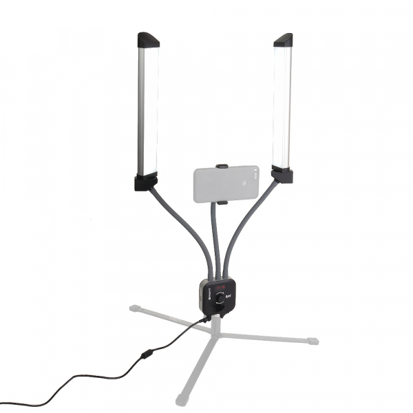 Falcon Eyes BloggerKit – осветитель с двумя светодиодными панелями, блоком управления и держателем для смартфона. Может использоваться как источник заполняющего света при ведении видеоблога, стрима, съемок для инстаграма, профессиональной предметной съемки.