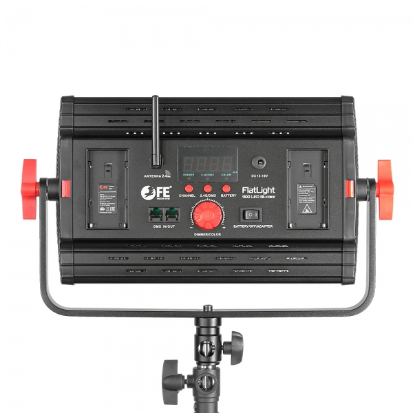 На задней панели прибора находится большой ЖК экран с 4-разрядной индикацией, удобный диммер (выполняющий функцию изменения яркости и цветовой температуры), кнопки управления режимами работы, кнопка выбора источника питания, вход и выход DMX (обеспечивают внешнее управление через консоль, приобретаемую отдельно).