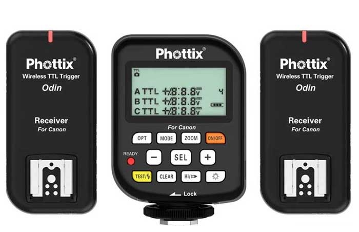 Радиосинхронизатор вспышек Phottix Odin TTL для Canon представляет собой передатчик, совмещенный с пультом управления, и двух приемниками для совместимых вспышек. Он позволяет без использования кабелей «поджигать» TTL вспышки, сохраняя в полной мере функции TTL, а также на расстоянии контролировать мощность и фокусное расстояние вспышек. Взаимодействие осуществляется на частоте 2.4 ГГц на расстоянии более чем 100 метров. Устройство Phottix Odin TTL предлагает фотографам 4 радио канала и 3 контролируемые группы вспышек. Вспышки могут контролироваться в традиционных для Canon TTL режимах пропорции A:B с настройкой EV +/- в три шага. Уникальна возможность устанавливать группы в режиме TTL/смешанном. Отдельные группы (А, В, С) могут контролироваться в TTLрежиме при помощи регулирования EV +/-. Группы также могут быть настроены в ручном режиме с удалённой регуляцией настройки мощности, либо выкючены.