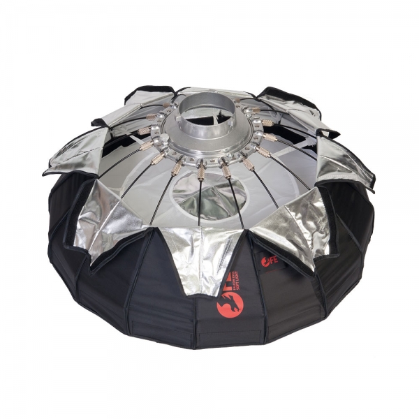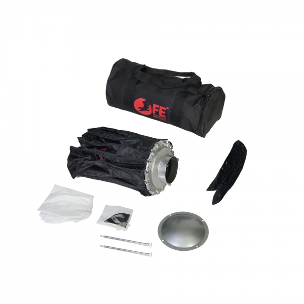 Конструкция тарелки представляет собой основание со специальным механизмом раскладывания спиц и натянутым на каркас тканевым серебристым рефлектором. При раскладывании происходит автоматическая фиксация спицы, а для того чтобы сложить тарелку необходимо лишь отпустить специальный стопор на каждой спице. В комплект входит металлический дефлектор, тканевый внутренний рассеиватель с серебристой вставкой, внешний рассеиватель на липучке и сотовая насадка с ячейками 4х4 см. Тарелка быстро подготавливается к работе, сборка занимает несколько секунд – достаточно просто разложить спицы и установить необходимую насадку. Установленную на приборе тарелку можно поворачивать на 360 градусов, выбранное положение фиксируется винтом на основании с внешней стороны.