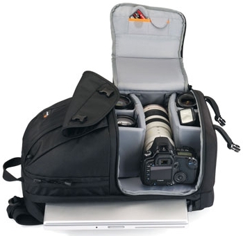 Рюкзак Lowepro Fastpack 350 совместим с большинством фотокамер. Дизайн обеспечивает быстрый доступ к оборудованию через боковую стенку. Основное отделение позволяет удобно расположить всё оборудование и аксессуары. Благодаря удобным плечевым ремням изогнутой формы, нагрузка распределяется равномерно, что позволяет носить оборудование длительное время, не испытывая дискомфорта. Компактный узкий рюкзак с двумя лямками. Вмещает одну камеру, снаряженную объективом в горизонтальном нижнем отсеке и может вместить еще два дополнительных объектива или вспышку. Также имеется дополнительное отделение для ноутбука с диагональю до 17"