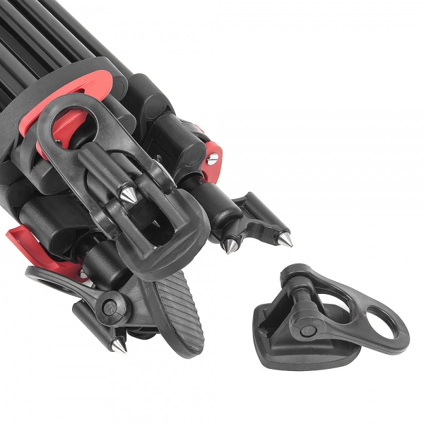 Ножки штатива вилочного типа. Секции ног надежно фиксируются клипсовыми замками. На концах штативных ног размещены парные шипы, на которые надеваются резиновые "башмаки". Таким образом, можно выбрать необходимый тип опоры для различных условий съемки. Шипы используются вне помещений, например для устойчивости на грунте или на льду, а резиновые опоры обеспечивают отличное сцепление на скользких и гладких поверхностях для защиты поверхности пола от царапин и повреждений. Для усиления штатива используется верхняя растяжка, которая не позволяет ногам разъезжаться и обеспечивает быстрое затухание колебаний.