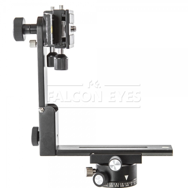 Кронштейн состоит из трех планок, две из которых жестко закрепляются между собой под углом 90˚ в рабочем положении и складываются для транспортировки, а третья, с узлом поворота камеры в вертикальной плоскости (наклон камеры), оборудована фиксатором положения с щелчком каждые 15˚ и градуированной шкалой с ценой деления 5˚. Два пузырьковых уровня, установленных на горизонтальной и вертикальной планке, помогут выставить камеру по горизонту. Все площадки с креплением типа «ласточкин хвост» оборудованы предохранителями: внутренняя защелка не позволит извлечь любую из трёх направляющих, пока не будет нажата кнопка разблокировки.