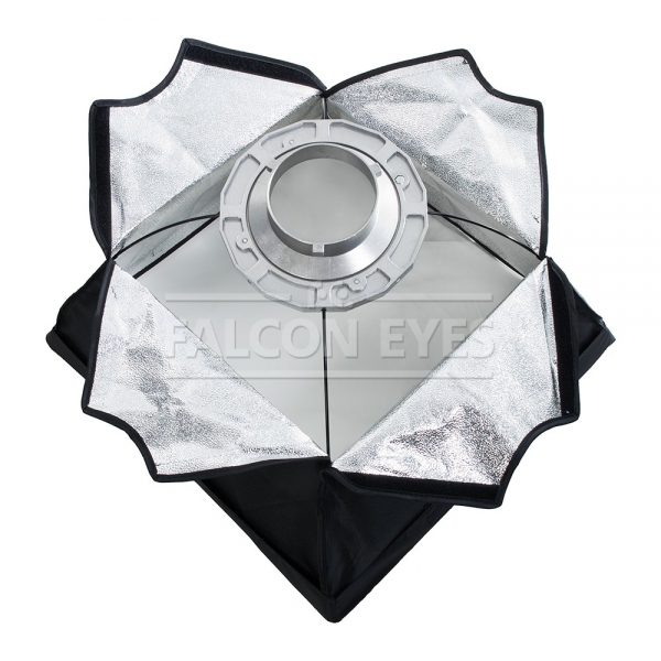 Установленный на приборе софтбокс можно поворачивать на 360 градусов, выбранное положение фиксируется винтом на адаптере. Внешний и внутренний рассеивающие экраны изготовлены из синтетических материалов. Закрытая конструкция позволяет избежать нежелательных бликов и потерь светового потока. Отражатель, с серебристой тканью внутри, обеспечивает равномерную засветку рассеивателя, который в свою очередь, благодаря большой поверхности, смягчает формируемые тени. Дополнительный внутренний диффузор улучшает равномерность светового потока. Наконечники на упругих металлических спицах не повреждают тканевые спицедержатели софтбокса и облегчают сборку конструкции. В комплекте чехол для хранения.