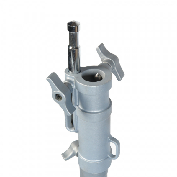 - Стальной выдвижной шпигот 5/8” с винтовым креплением и отверстие 1⅛” (junior) позволяют установить оборудование весом до 20 кг. Для крепления тросика, страхующего установленное оборудование, предусмотрена металлическая проушина.