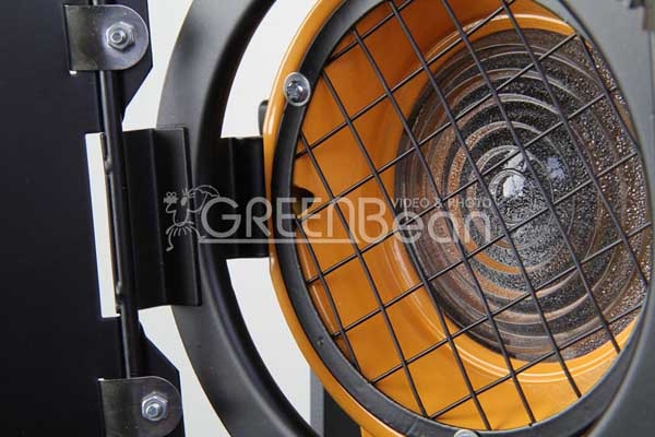 Самый компактный в линейке галогенных френелевских осветителей GreenBean. На расстоянии 2 м от осветителя максимальный диаметр светового пятна составляет 160 см, минимальный 40 см. Вращая ручку на задней стенке прибора оператор перемещает лампу и металлический сферический отражатель внутри конструкции, изменяя тем самым как диаметр светового пятна, так и его яркость. Кольцо с металлическими шторками может поворачиваться на 360 градусов. Кольцо со шторками легко снять (оно фиксируется подпружиненным держателем, расположенным в верхней части корпуса над линзой Френеля). Фронтальная линза Френеля изготовлена из стекла и защищена металлической сеткой. Корпус осветителя металлический (сталь и алюминиевый сплав), двойной с воздушным промежутком для эффективного конвекционного охлаждения. Для удобства работы с прибором кнопки включения и регулятор мощности смонтированы в блоке на кабеле питания.