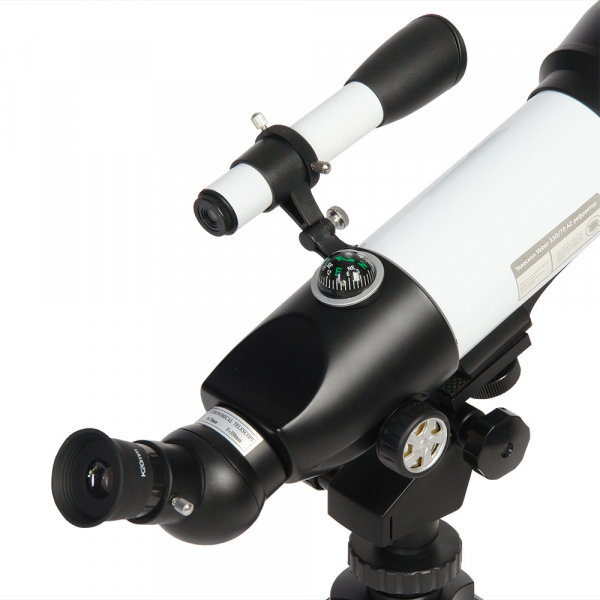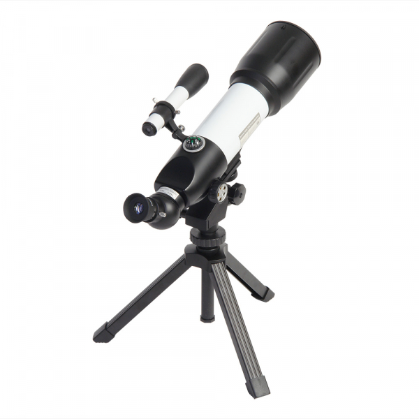 Компактный телескоп-рефрактор. Удобен как для домашних астрономических (и не только) наблюдений, так и для вылазок на природу. Его длина всего 45 см, он легкий и компактный. При этом этот телескоп вовсе не детская игрушка! Его ахроматическая оптика дает хорошее, четкое, резкое изображение без окрашенности по краям поля зрения. С набором окуляров, входящих в комплект, можно получить увеличение от 17,5х (ближняя точка фокусировки ок.5 м) до 116,4х. Veber 350×70 собирает света на 35% больше, чем аналогичный телескоп с диаметром объектива 60 мм. На практике это значит: при дневных наблюдениях — хорошая картинка будет и в ближних сумерках, при ночных наблюдениях — картинка будет более резкой. Об окулярной части следует сказать особо: она расположена под углом 45° к оси прибора, и может поворачиваться вокруг своей оси на 360° (8 фикс.положений). Все это делает очень комфортным наблюдение — как из положения сидя, так и из положения стоя. При этом изображение не зеркальное, где «лево» и «право» поменялись местами, а прямое! (в конструкции используется призма Шмидта с «крышей»). Таким образом, этот телескоп рекомендуется использовать не только по прямому назначению, но и как зрительную трубу. Что можно увидеть в этот телескоп: кратеры Луны диаметром ок.10 км, кольца Сатурна, Марс. Его проницающая способность 10.99 звёздных величин — крупные скопления галактик также будут доступны для любознательных наблюдателей. В комплекте поставляется специальный настольный штатив. Он имеет механизм плавных подвижек по вертикали и по горизонтали — с помощью вращающихся рукояток. Т. к. крепление трубы осуществляется с помощью винта 1/4", при необходимости можно использовать любой фотоштатив.
