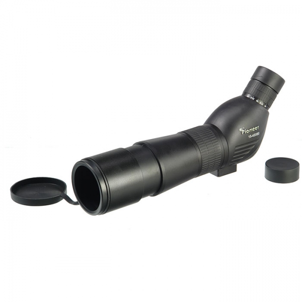Зрительная труба с переменной кратностью увеличения от 15 до 45х и окуляром, расположенным под углом 45°. Корпус выполнен из ударопрочного ABS пластика, обработан специальным покрытием soft touch, для защиты от выскальзывания. Фокусировка осуществляется обрезиненным кольцом на объективе прибора, зуммирование — на окулярной части. Благодаря многослойному просветлению и применению оптического стекла BAK-4, изображение яркое и контрастное, с правильной цветопередачей и без искажения по краям поля зрения. Труба снабжена выдвижной блендой для наблюдения в солнечную погоду. Выдвигающийся наглазник для удобства наблюдения в обычных или солнцезащитных очках. Для удобства, трубу можно установить на обычный фотоштатив с поворотной площадкой, например FalconEyes SL–2400WS.